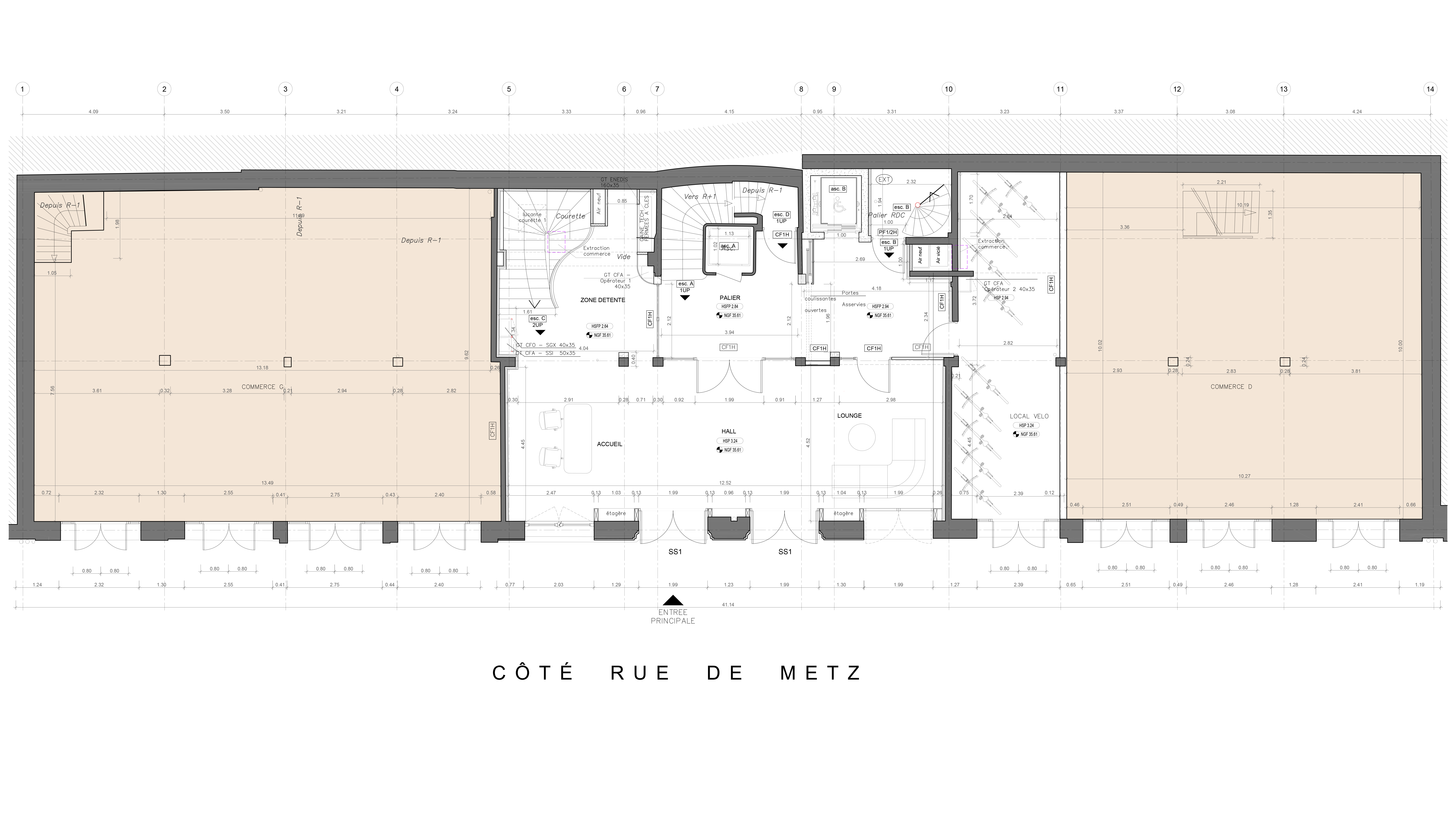 Les habillages seront en placage finition bois et les portes permettant d’accéder aux étages seront en métal noir pour reprendre le vocabulaire de la façade.